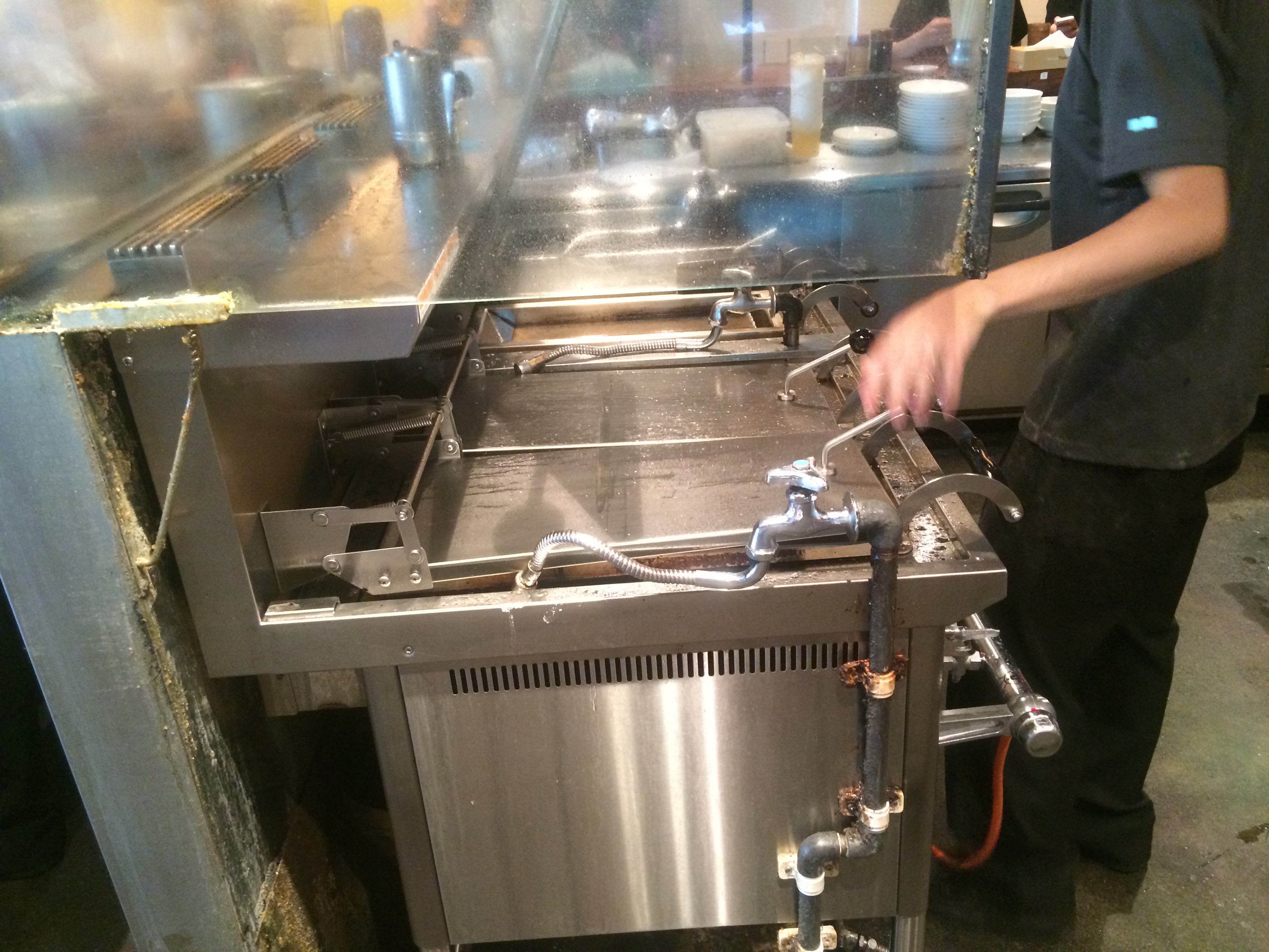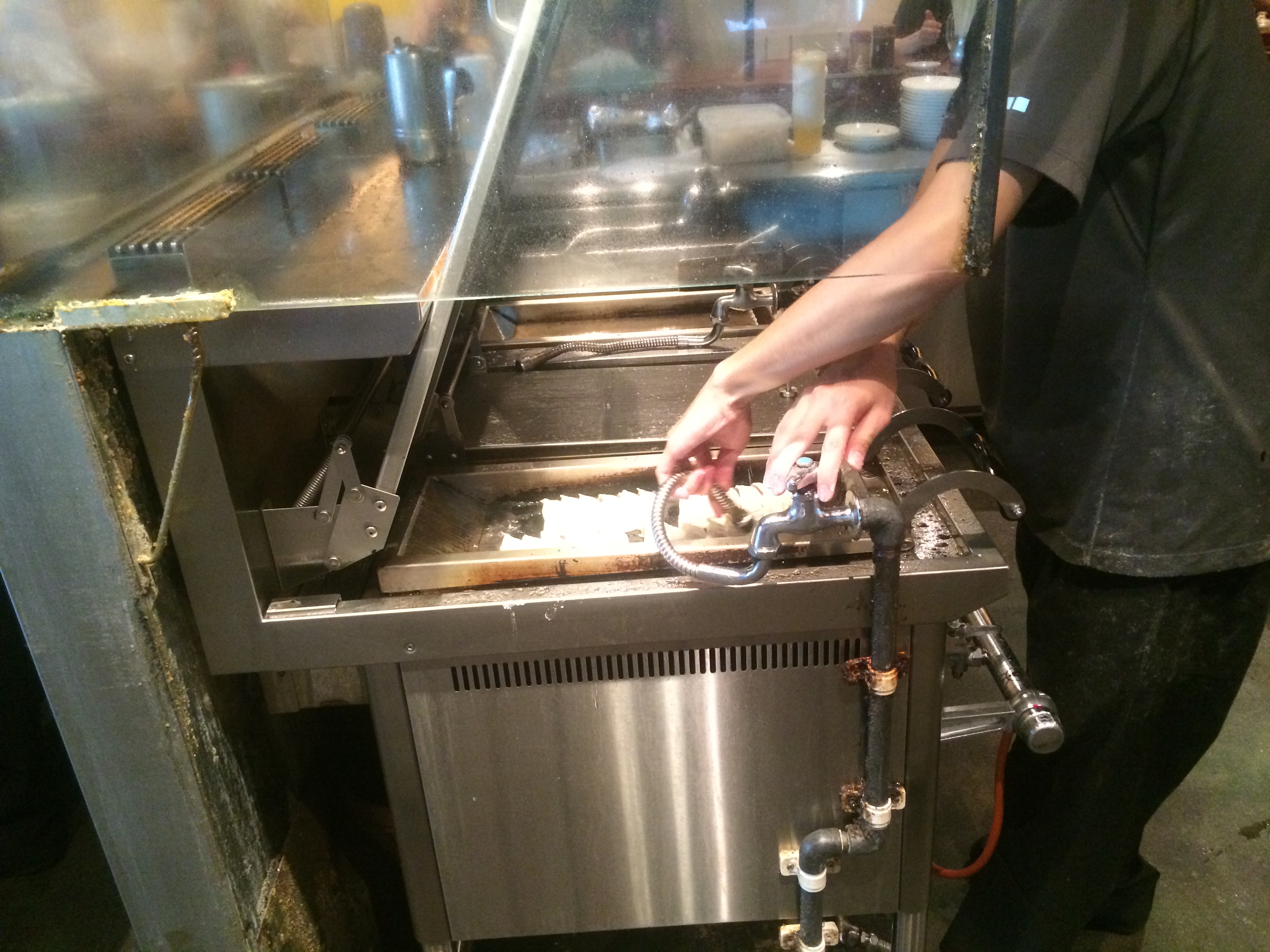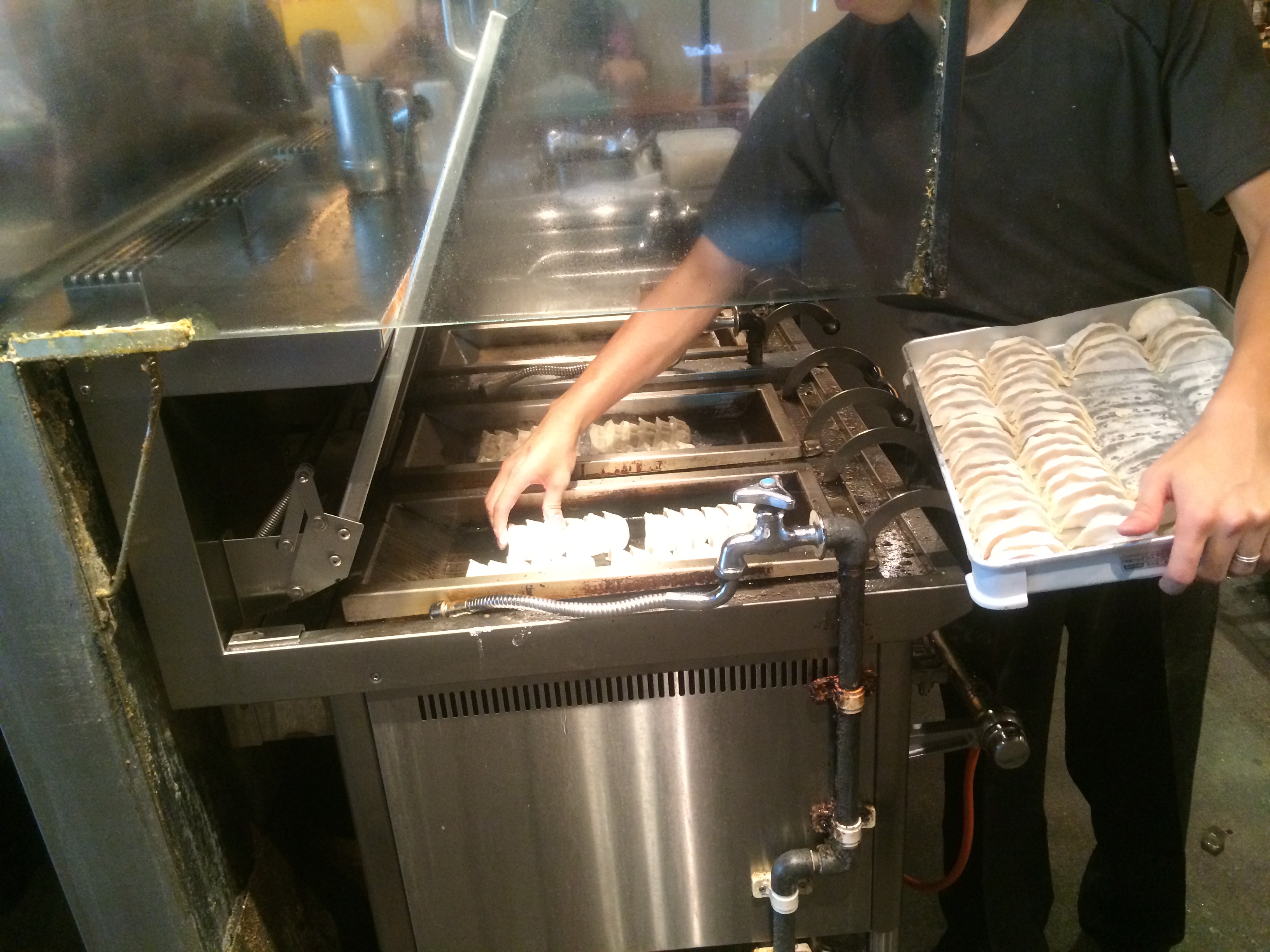 Gyoza are brought out frozen and placed in the preoiled cooking surface