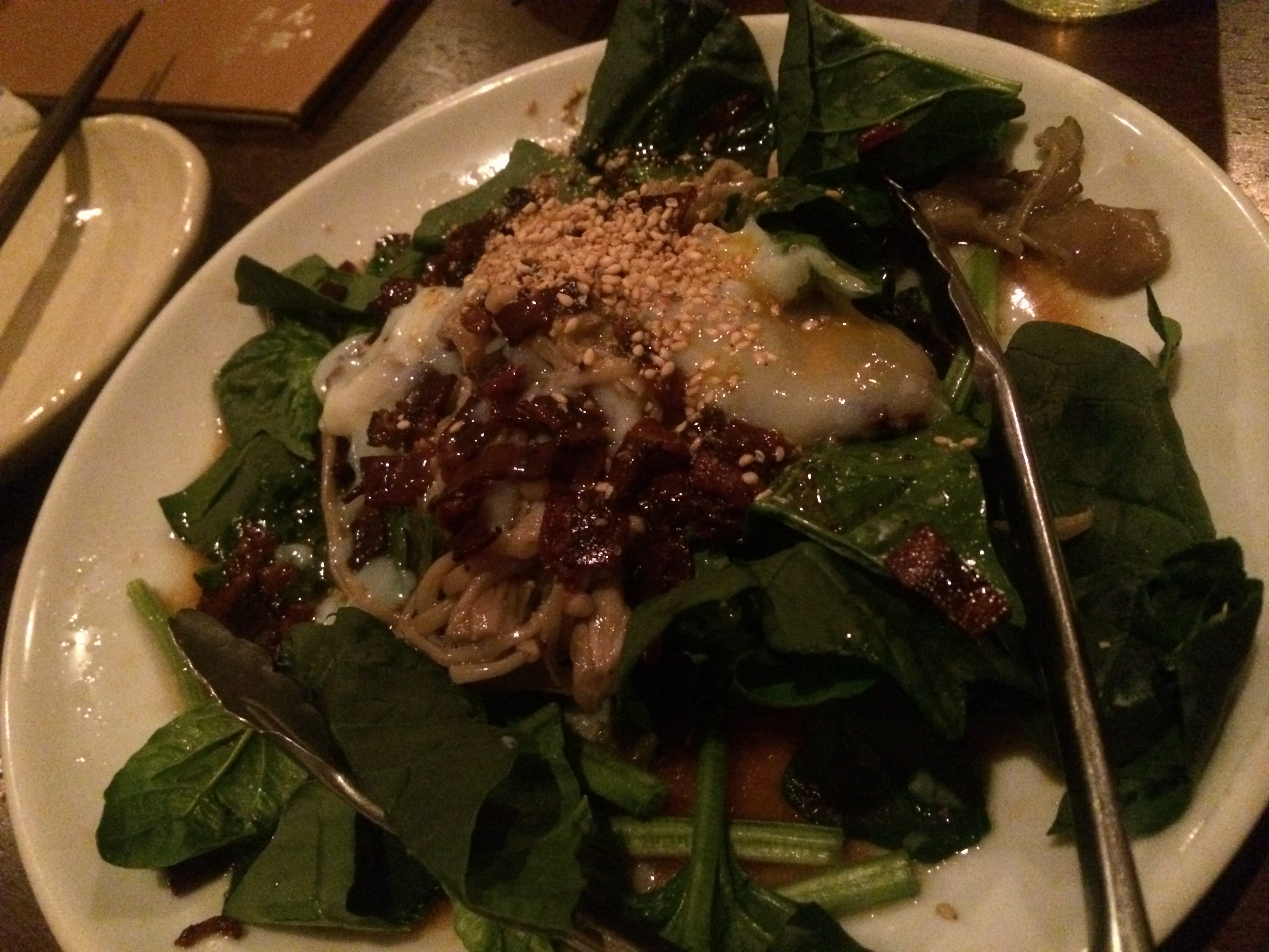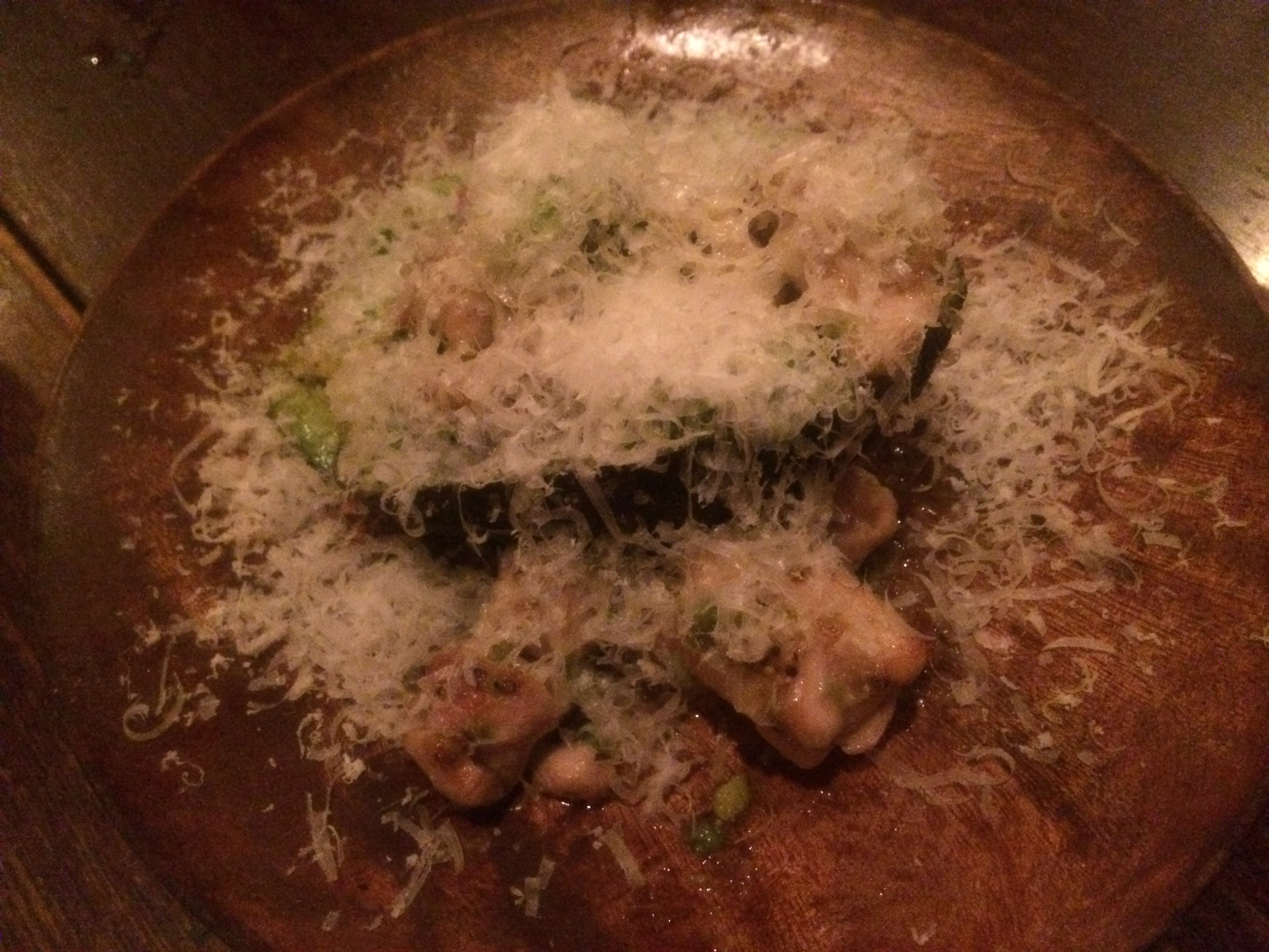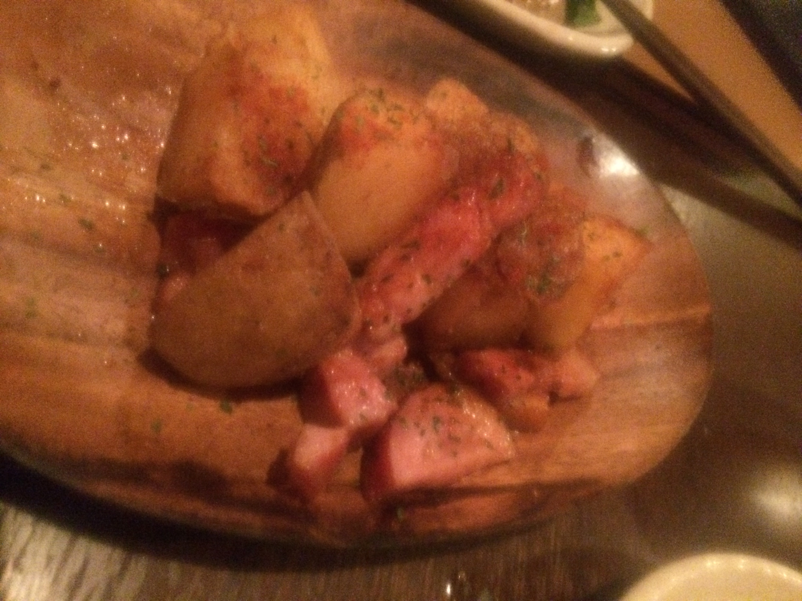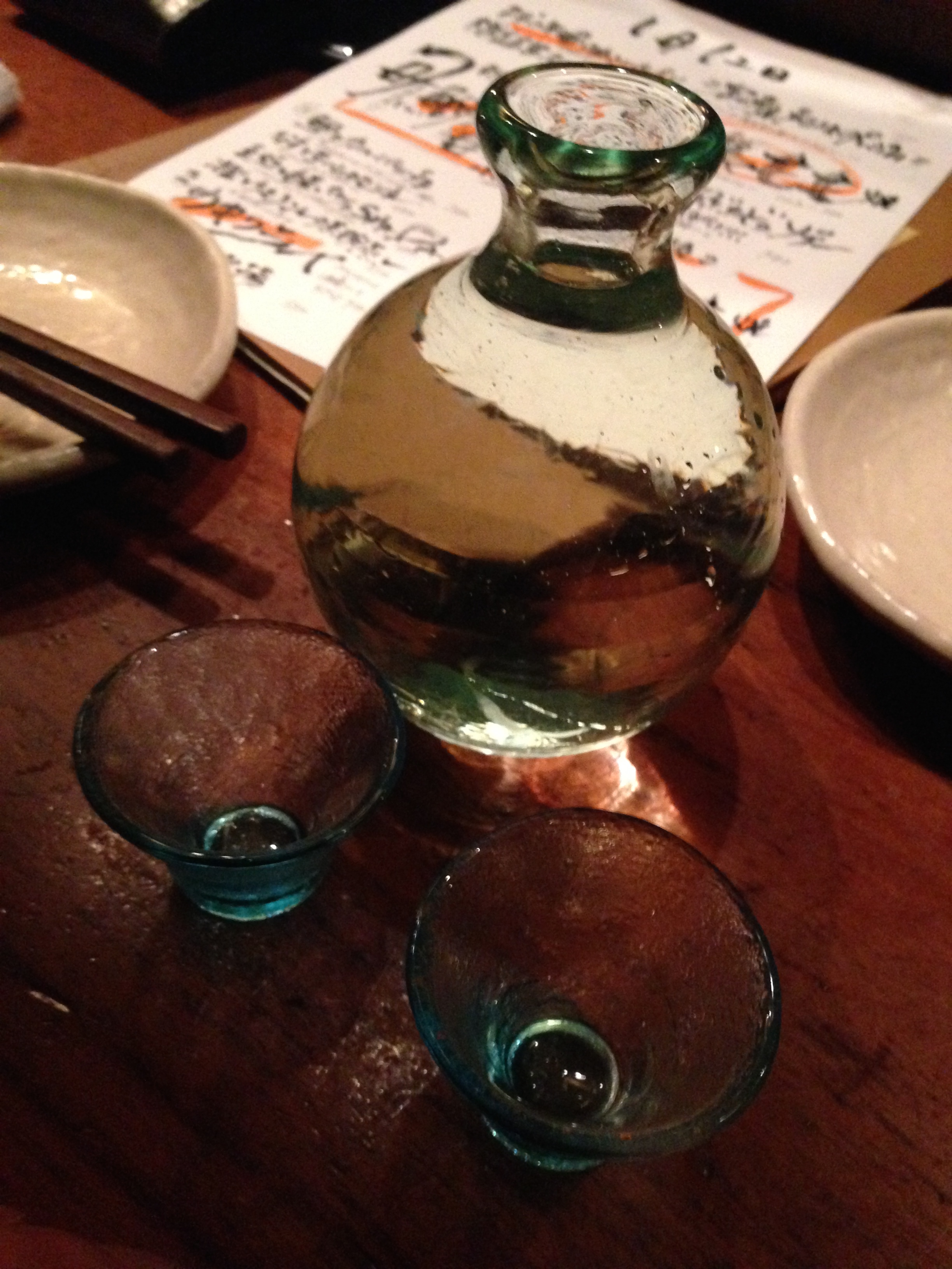 One dish I wasn’t so sure about when it was ordered was the cheese tofu. Then out came gelatinous off white coloured dish topped with what looked like a soy sauce and flaked garlic with a side of sliced baguette. After seeing my friends dive into it like it was going out of fashion quick i followed suit and what a surprise. It had the wonderful silky smooth texture of tofu for sure, but tasted like creme caramel with an ever such slight hint of cheese. The soy was in fact a caramel sauce and the garlic was in fact sliced almonds. More of a dessert than a main, but delightful nevertheless. By the time I realised what I was enjoying I looked to see the plate empty and my friends looking in various directions as if it had nothing to do with them. The soup gyoza was warm and comforting. Still prefer the fried ones though The avocado chicken and parmesan was nice rich and salty hit The anchovy potato was the closes thing I’ve had to 1. roast potatoes and 2 proper bacon. Not too heavy on the anchovy paste but a good dollop’s worth to coat a side or two Spinich, mushroom and onsen tomago (half boiled egg) salad was a yummy irony hit. Every salad should have an onsen tomago! Sake here was pretty tasty. No idea which one it was though.