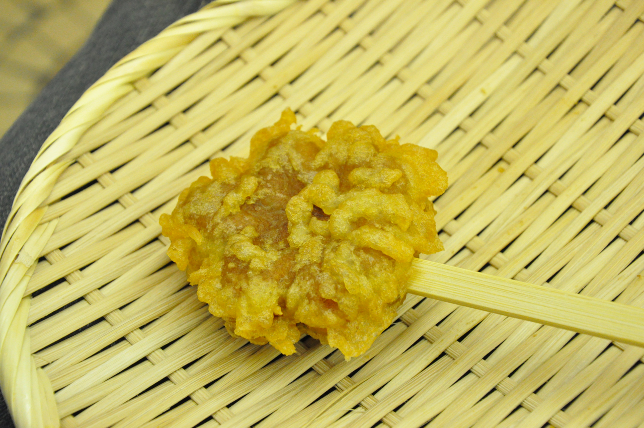 A MD from the bank I am working at took me and another colleague out for lunch. A short ride away from the office opened a whole host of different eating options.Her favourite Tempura place was carefully selected after she heard I loved my food. We got there just before 12 to avoid the mad lunch rush. Through a typical small building entrance on the first floor going through a tiny sliding wooden door opened up to a restaurant that probably seated 20 people. My host kindly ordered for me (only two things on the lunch menu) which was a tempura of prawn and baby scallops on rice (Don). She also explained that sushi and tempura chefs are typically men, but this lady took over the helm when her father passed away a few years ago. She carefully gathered the filling mixing it with the batter in a small bowl before dropping it in oil pretty much freestyle. Attentively ensuring it was cooked evenly by penetrating it to let the raw batter ooze out.